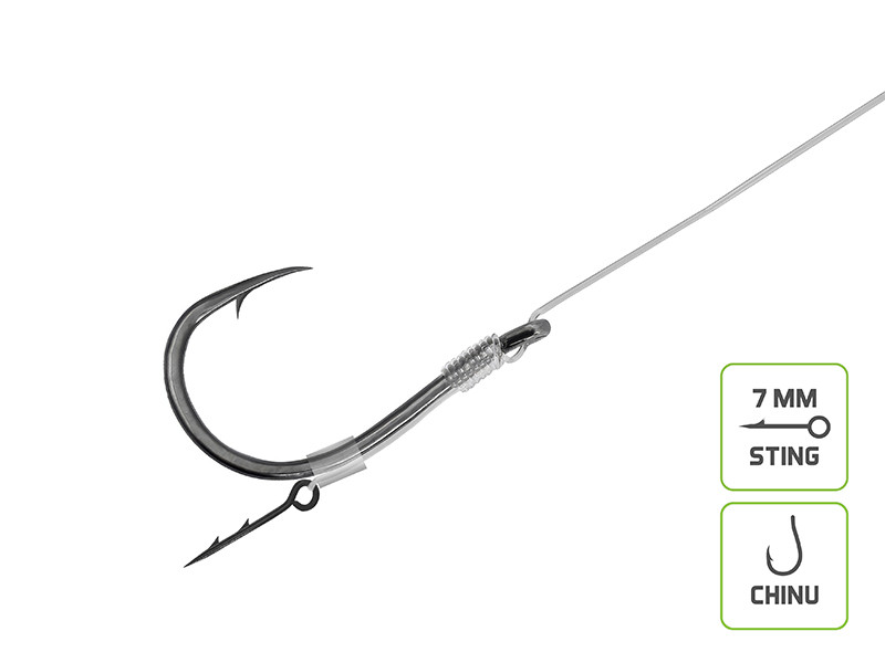 Ji pagaminta iš kokybiško fluorokarbono, kuris beveik nematomas po vandeniu. Be to, kad yra diskretiška, ji atspari trinčiai, todėl yra patikimas pasirinkimas žvejojant šalia kliūčių ar ant kieto dugno. Norėdami sėkmingai pagauti žuvį, naudojome „Chinu“ kabliukus. Jų specifinė forma ir puikus aštrumas užtikrina, kad jie nepaleis, kai žuvį trauksite.