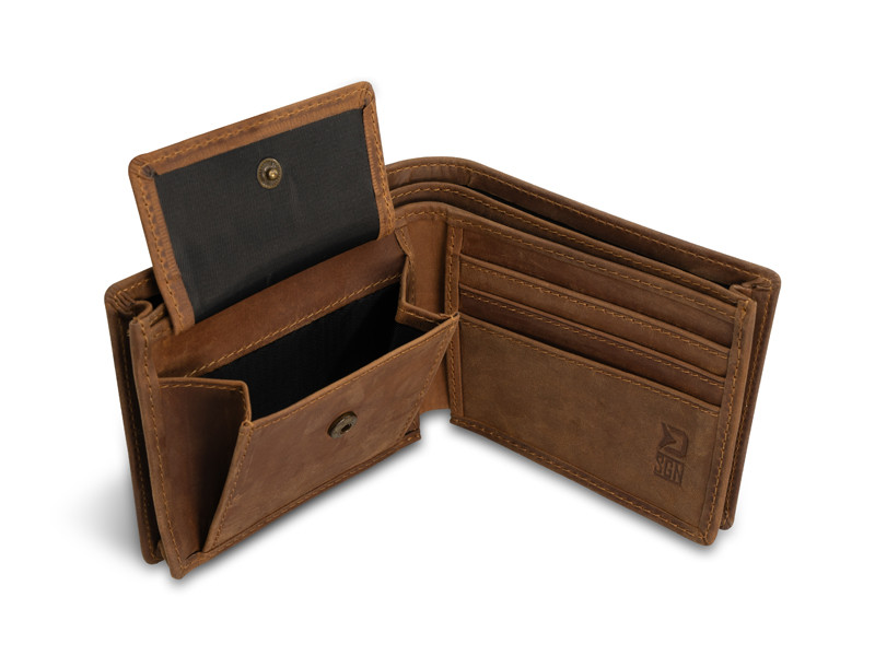 Piniginė pagaminta iš tikros tamsiai rudos odos, kad būtų patvaresnė ir maloni rankai.
